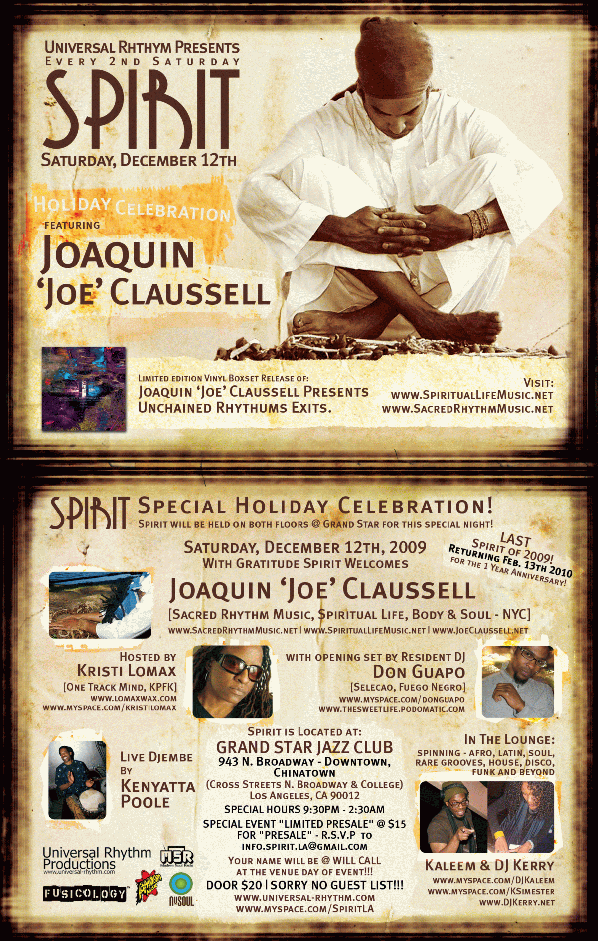SAT. DECEMBER 12th SPIRIT w/ JOE CLAUSSELL, DON GUAPO, KRISTI LOMAX, DJ KERRY & KALEEM